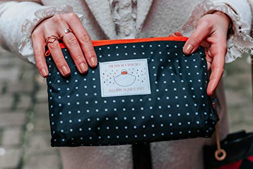 Ou encore pour le poncho à petit pois noir qui se glisse dans sa pochette aprés usage :